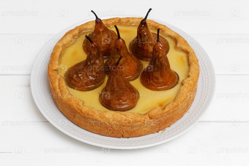 Пирог с грушами, сливочным маслом и желе на белом деревянном столе