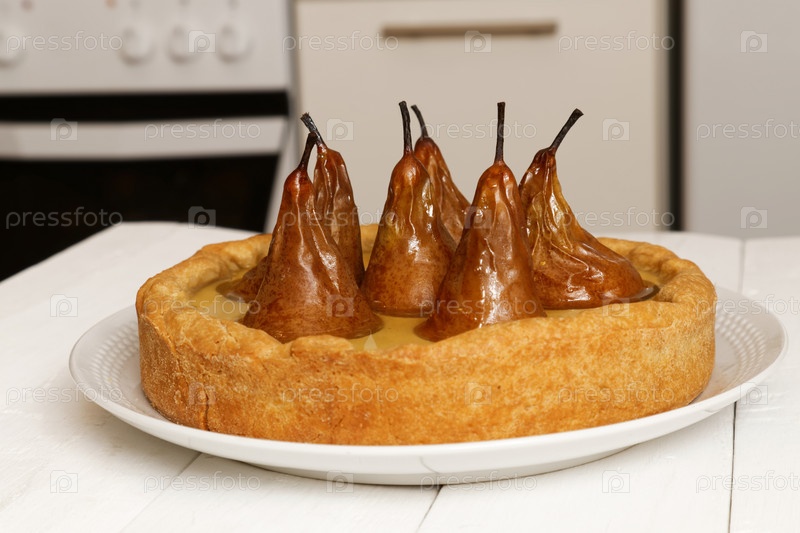 Пирог с грушами, сливочным маслом и желе на размытом фоне кухни