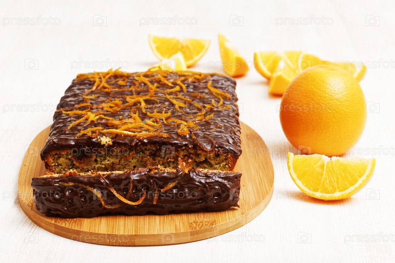 Шоколадно-апельсиновый торт с отрезанным куском рядом с апельсином на белом деревянном фоне. Мелкий фокус