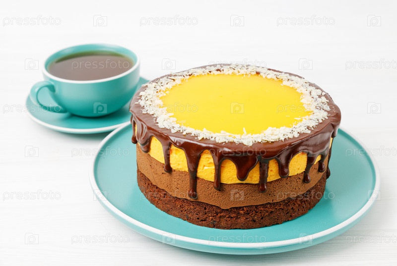 Домашний шоколадный чизкейк с ломтиками миндаля на белом деревянном столе. Вид сверху