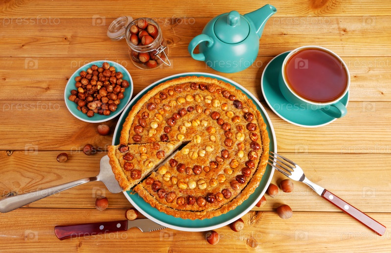 Домашний пирог, украшенный фундуком и чашкой чая на деревянном столе. Широкий ангельский вид