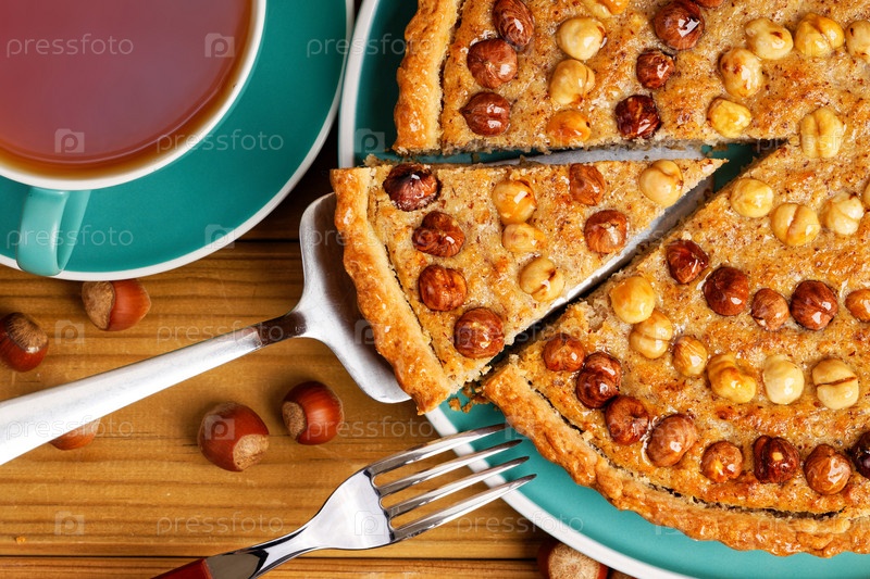 Домашний пирог крупным планом, украшенный фундуком и чашкой чая на деревянном столе. Вид сверху