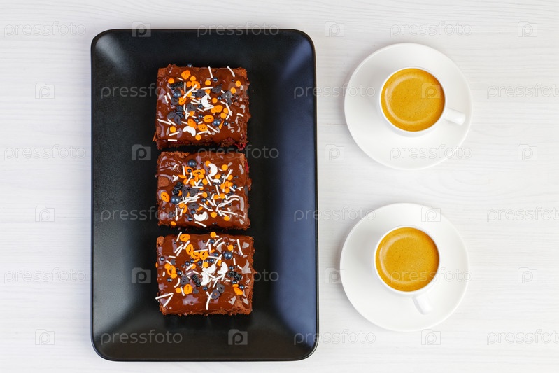 Домашнее пирожное и две чашки кофе эспрессо на белом деревянном столе. Вид сверху