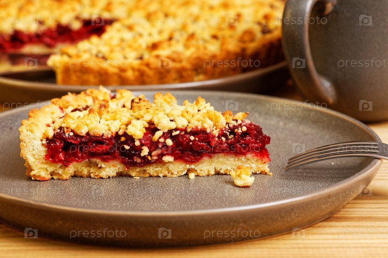 Кусок крупного плана домашнего вишневого пирога на деревянном столе. Мелкий фокус