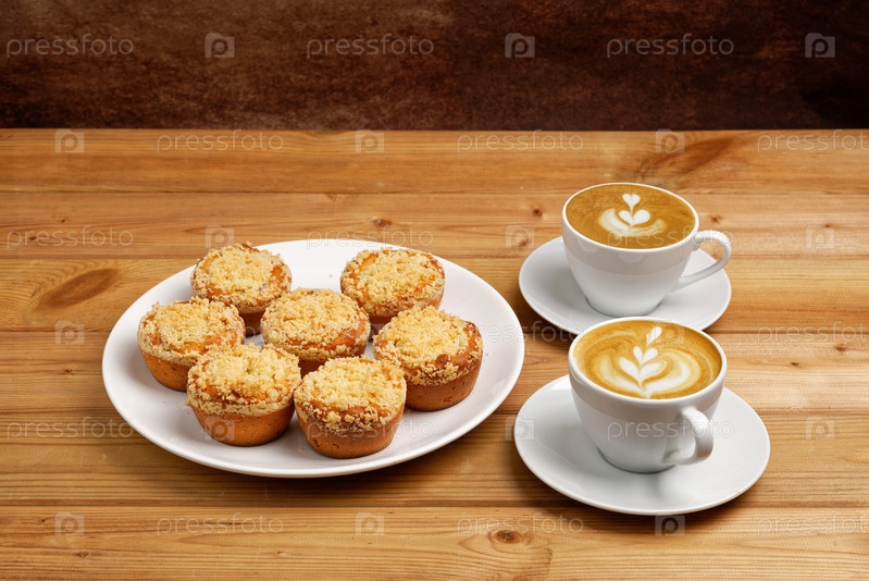Свежеиспеченные домашние кексы и две чашки кофе капучино на деревянном столе