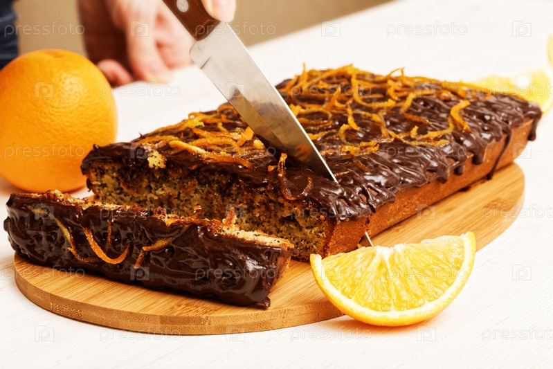 Домохозяйка отрезала кусок шоколада и апельсиновый торт