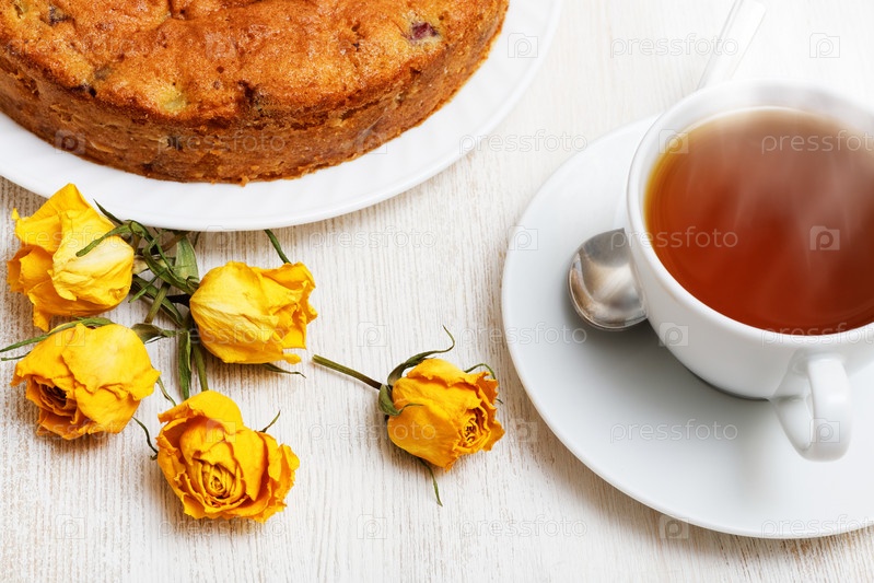 Крупный план домашнего грушевого торта с шоколадом и вишней, чашкой чая и сушеными желтыми бутонами роз на белом деревянном столе