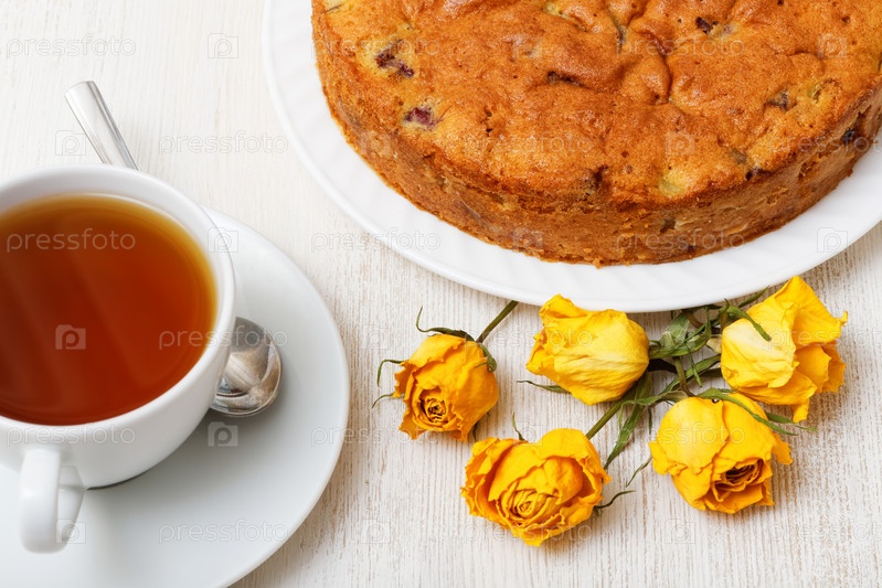 Крупный план домашнего торта с шоколадом и вишней, чашкой чая и сушеными желтыми бутонами роз на белом деревянном столе