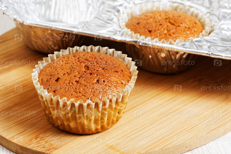 Домашние кексы в фольге на белом деревянном столе