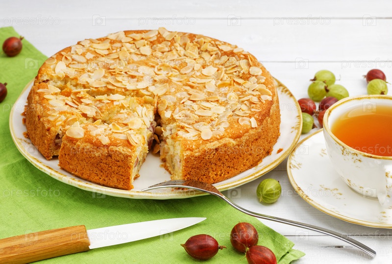 Домашний пирог с крыжовником, украшенный миндальными лепестками и чашкой чая на белом деревянном столе. Мелкий фокус