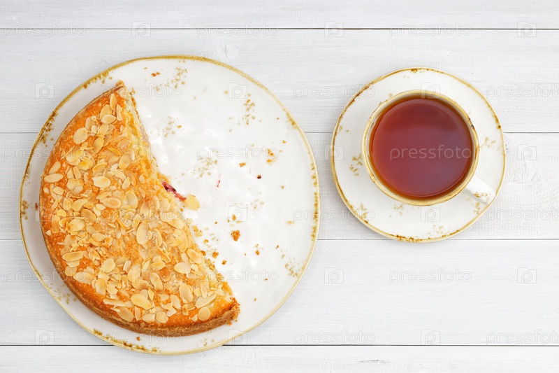 Половина домашнего пирога с крыжовником, украшенного миндальными лепестками и чашкой чая на белом деревянном столе. Вид сверху
