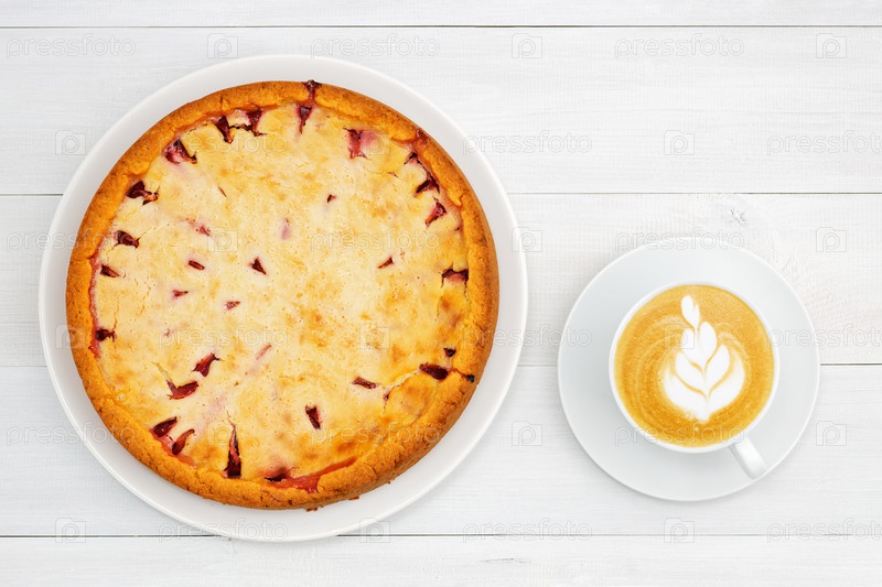 Домашний пирог со сливой и чашка кофе капучино на белом деревянном столе. Вид сверху