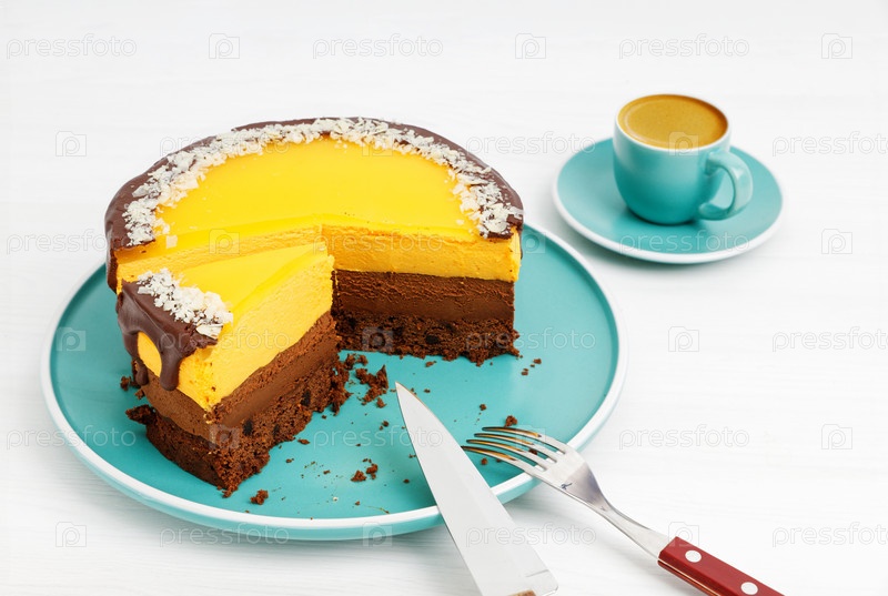 Домашний чизкейк с шоколадом и апельсином, посыпанный ломтиками миндаля и чашкой кофе эспрессо на белом деревянном столе. Мелкий фокус