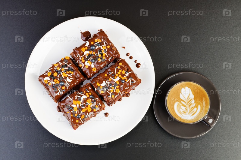 Домашнее пирожное и чашки кофе капучино на темном столе. Вид сверху