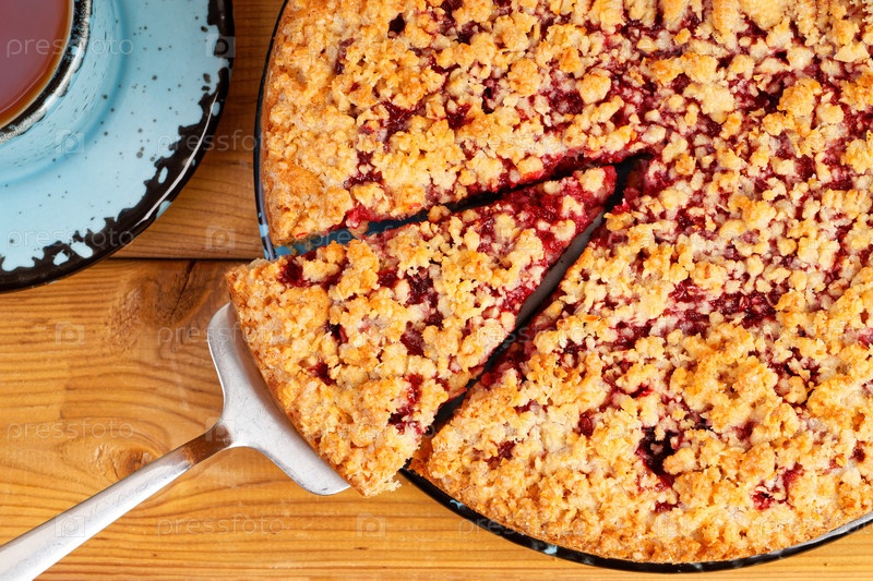 Крупный план домашний малиновый пирог со штрейзелем и чашкой чая на деревянном столе. Вид сверху