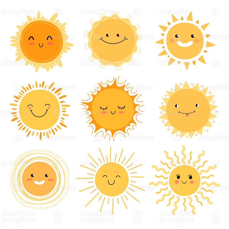 Солнце. Различные улыбающиеся лица солнца. Смайлик, смайлик