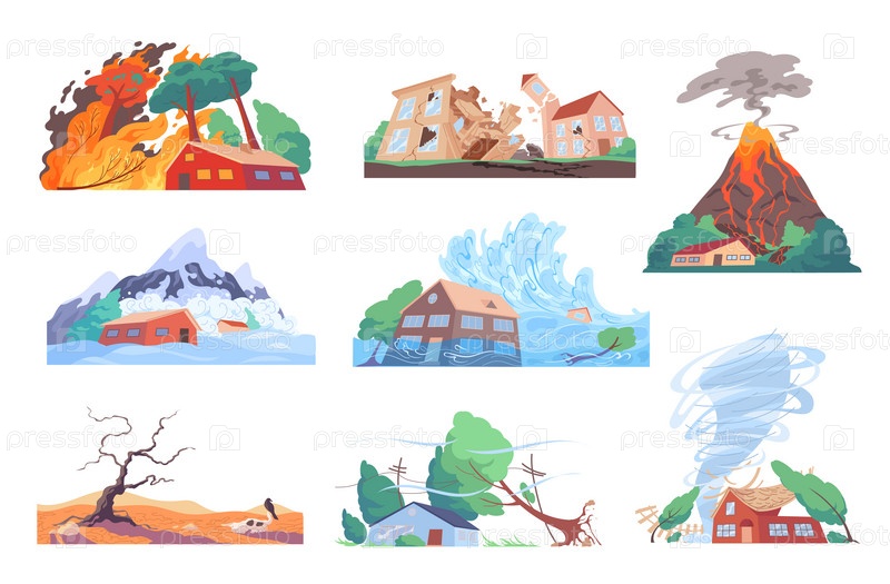 Стихийные бедствия, стихийные бедствия, векторная иллюстрация катастроф