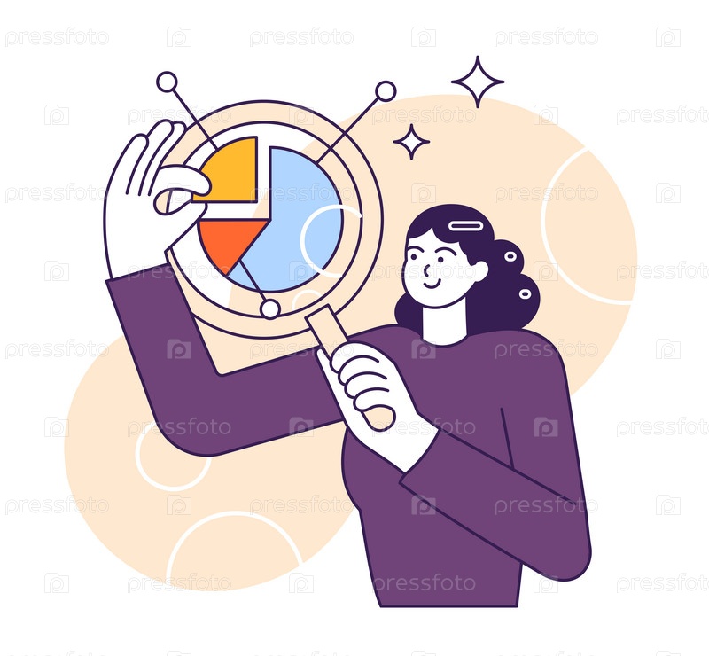 Женщина смотрит на диаграмму через увеличительное стекло. Бизнес-анализ