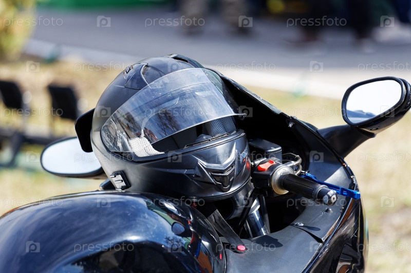 Черный мотошлем крупным планом на руле мотоцикла на размытом фоне