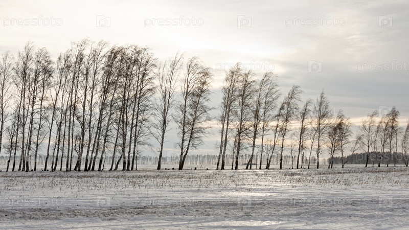 Зимний пейзаж. Ряд голых деревьев среди заснеженного поля
