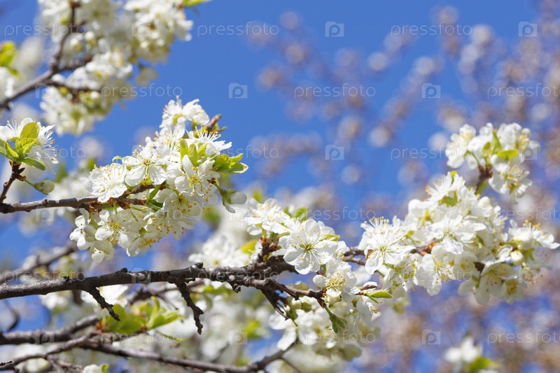 Крупным планом цветущая ветвь вишни на размытом фоне. Мелкий фокус