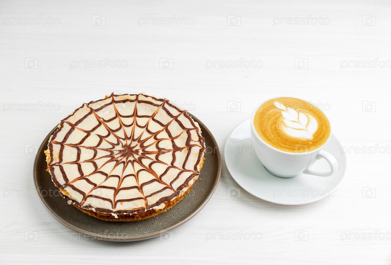 Домашний шоколадный чизкейк и чашка кофе капучино на белом деревянном столе