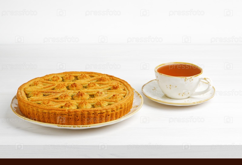 Домашний лимонный пирог с крыжовником и чашка чая на белом деревянном столе. Копипространство