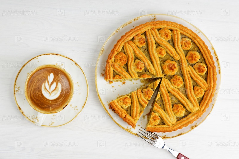 Домашний лимонный пирог с крыжовником и чашка кофе капучино на белом деревянном столе. Вид сверху