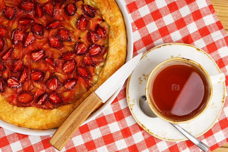Домашний открытый пирог с клубникой и ревенем. Вид сверху