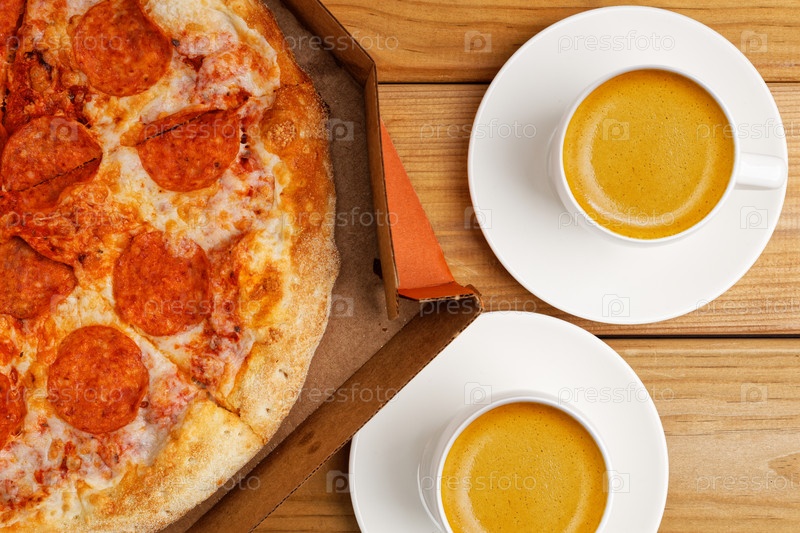 Коробка крупным планом открытая с пиццей пепперони и двумя чашками кофе эспрессо на деревянном столе. Вид сверху