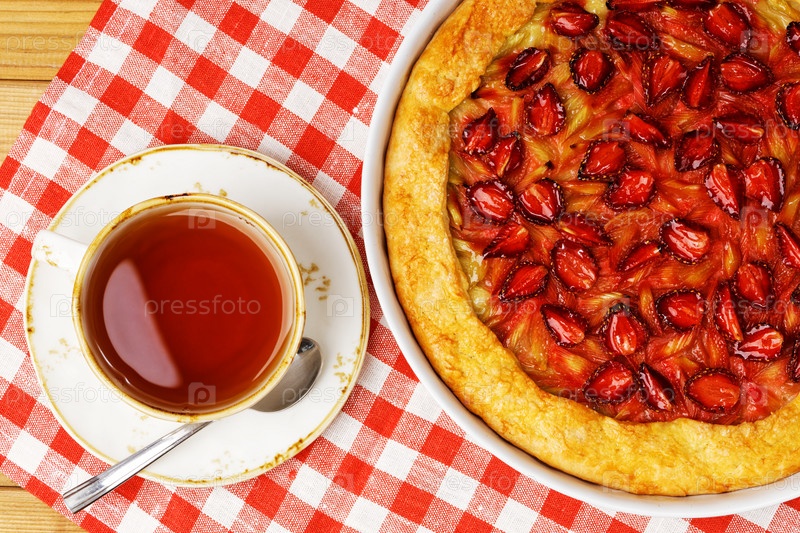 Крупный план домашнего открытого пирога с клубникой и ревенем. Вид сверху