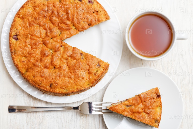 Крупный план домашний торт с отрезанным куском и чашкой чая на белом деревянном столе. Вид сверху