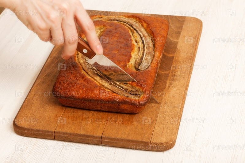 Домохозяйка отрезала кусок домашнего бананового торта на кухонной разделочной доске
