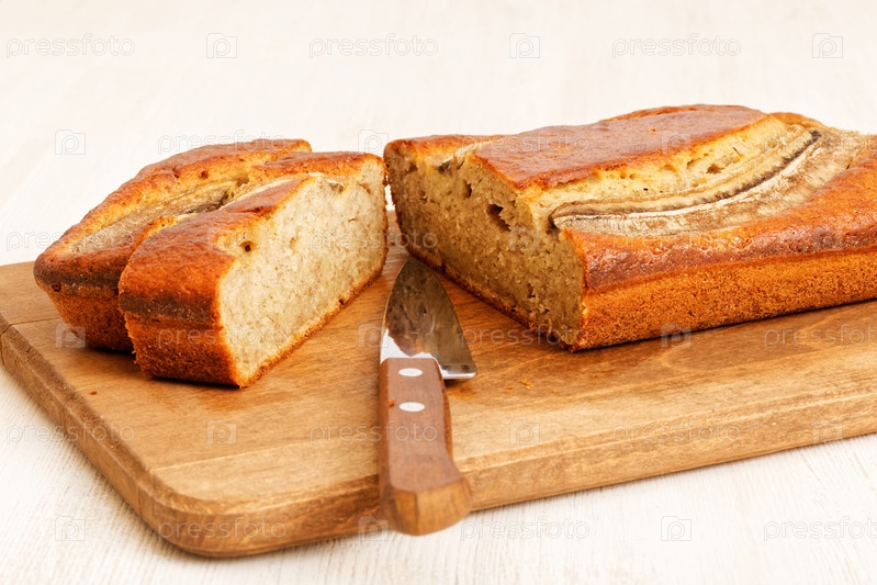 Домашний банановый хлеб и нож на кухонной разделочной доске. Мелкий фокус