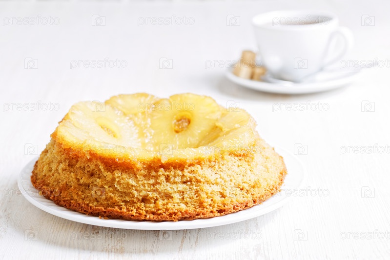 Ананас перевернутый торт и чашка чая на белом деревянном столе. Мелкий фокус. Высокий ключ