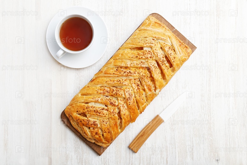 Домашний шоколадный чизкейк с ломтиками миндаля на белом деревянном столе. Вид сверху