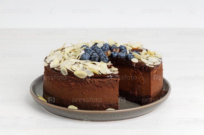 Домашний шоколадный чизкейк с ломтиками миндаля на белом деревянном столе. Вид сверху