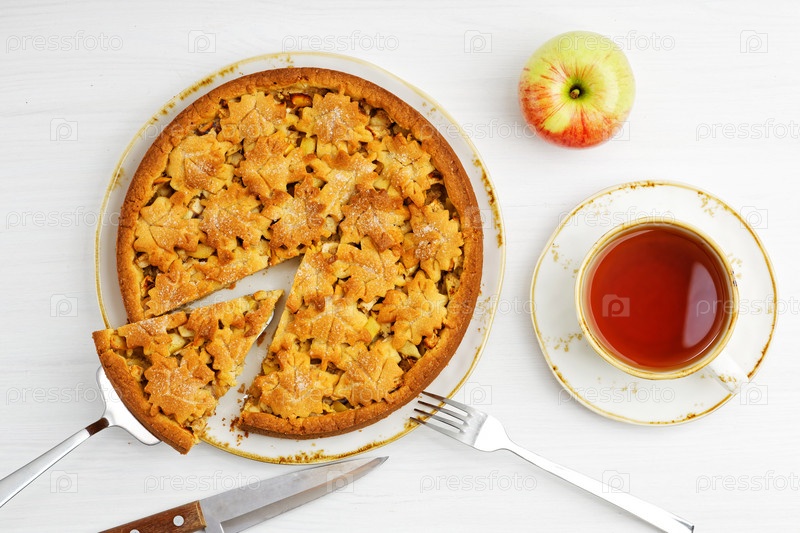 Свежий испеченный домашний пирог с яблоком и корицей и чашка чая на белом деревянном столе. Вид сверху