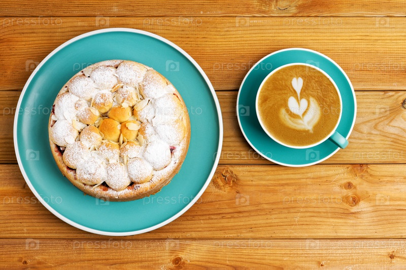 Домашний вишневый пирог с миндальными лепестками и чашкой кофе капучино на деревянном столе. Вид сверху