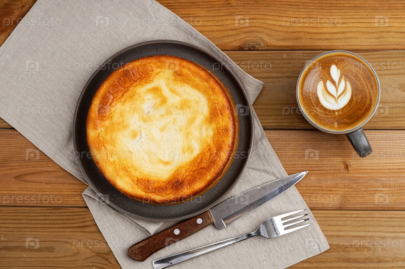 Домашний яблочный пирог и чашка кофе капучино на деревянном столе. Вид сверху