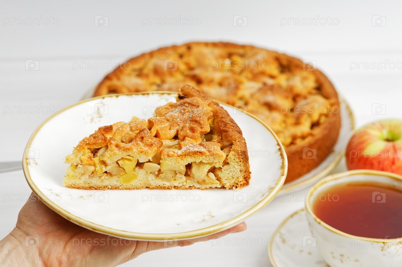 Кусок крупного плана домашнего пирога с яблоком и корицей. Мелкий фокус
