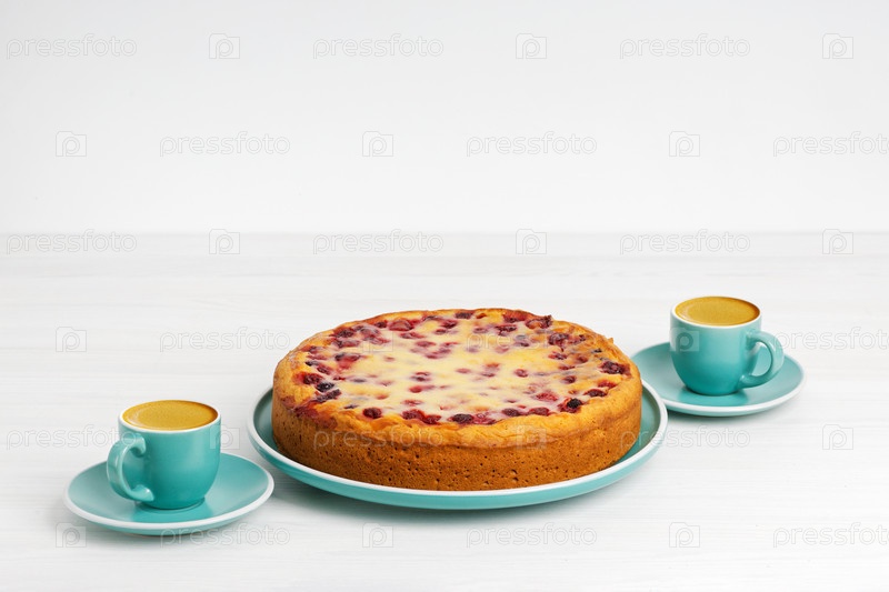 Домашний ягодный пирог и две чашки кофе эспрессо на белом деревянном столе. Копипространство