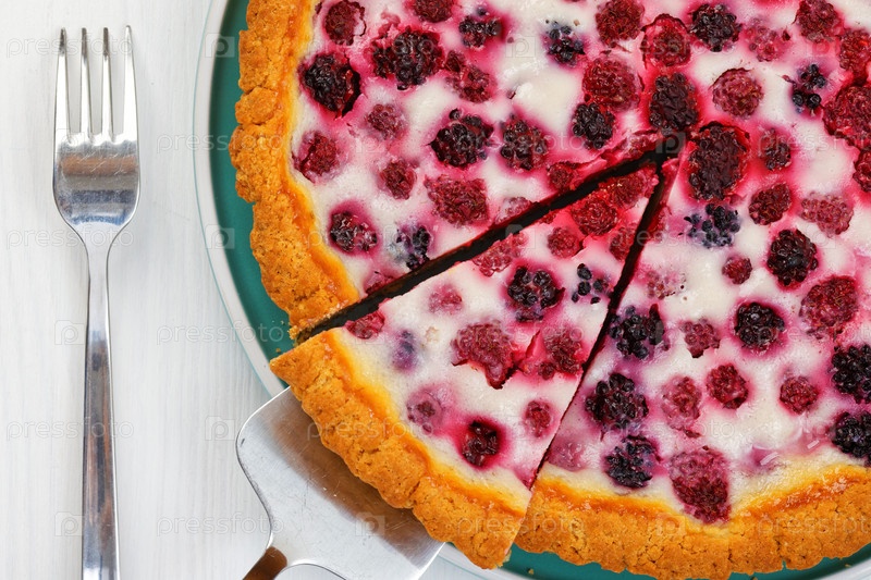 Ягодный пирог крупным планом домашний с малиной и ежевикой на белом деревянном столе. Вид сверху
