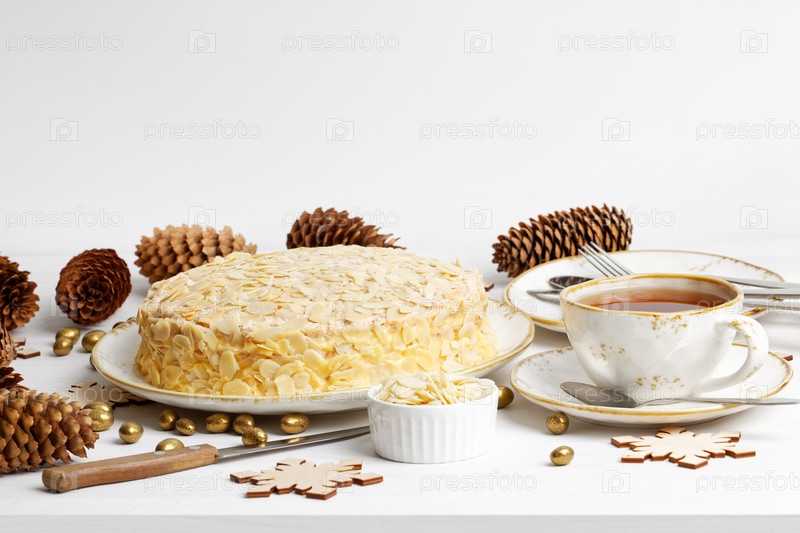 Домашний торт с лепестками миндаля и чашкой чая на белом деревянном столе. Передний план