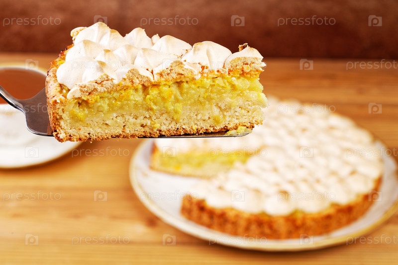 Крупный план домашнего пирога, украшенного безе. Мелкий фокус