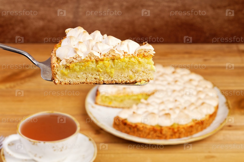 Крупный план домашнего пирога, украшенного безе. Мелкий фокус