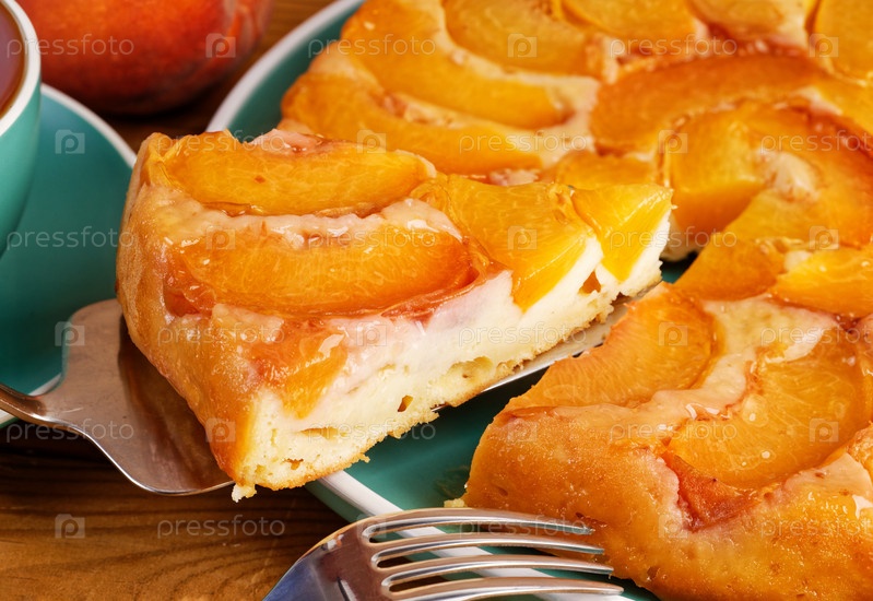 Крупным планом домашний пирог с персиками на деревянном столе. Мелкий фокус