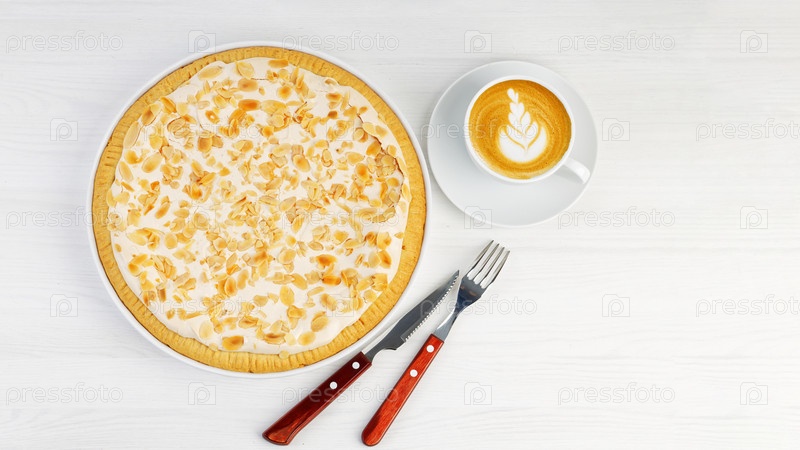 Домашний торт с безе и миндальными лепестками на белом деревянном столе. Вид сверху