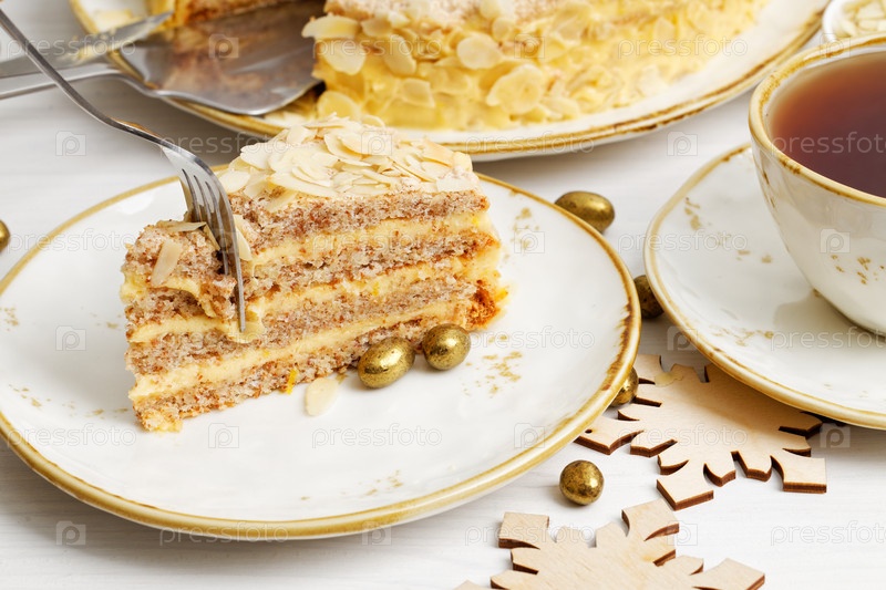 Кусок домашнего торта с миндальными лепестками на белом деревянном столе. Мелкий фокус