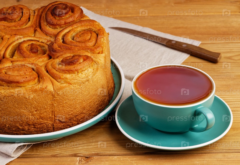 Крупным планом домашние булочки с корицей из дрожжевого теста и чашка чая на деревянном столе
